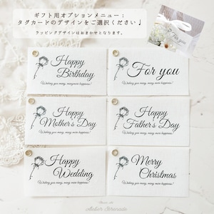 クラフト袋(ボックス式ケースをご選択の場合はボックス式ケース)+リボン+ギフトタグ+お渡し用のハンドルバッグをお付けいたします。