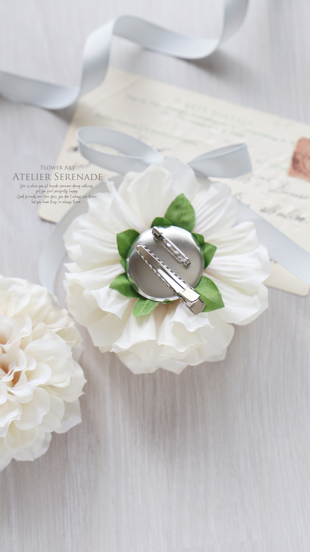 ※コサージュのデザインによっては、金具クリップのつまみ部分が正面や側面から見える場合がございます。予めご了承ください。