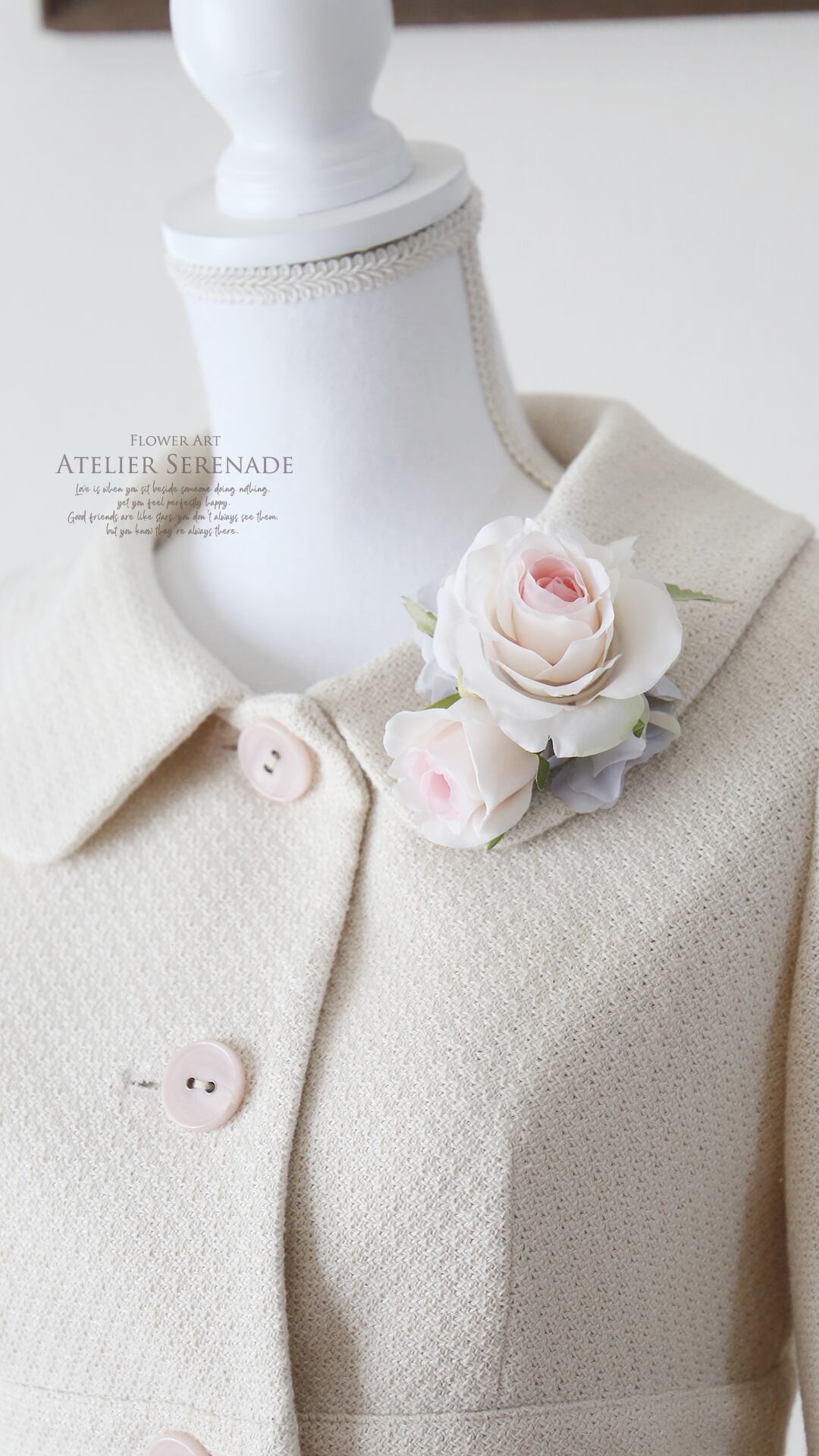 大輪のローズが印象的な、存在感のあるコサージュ。