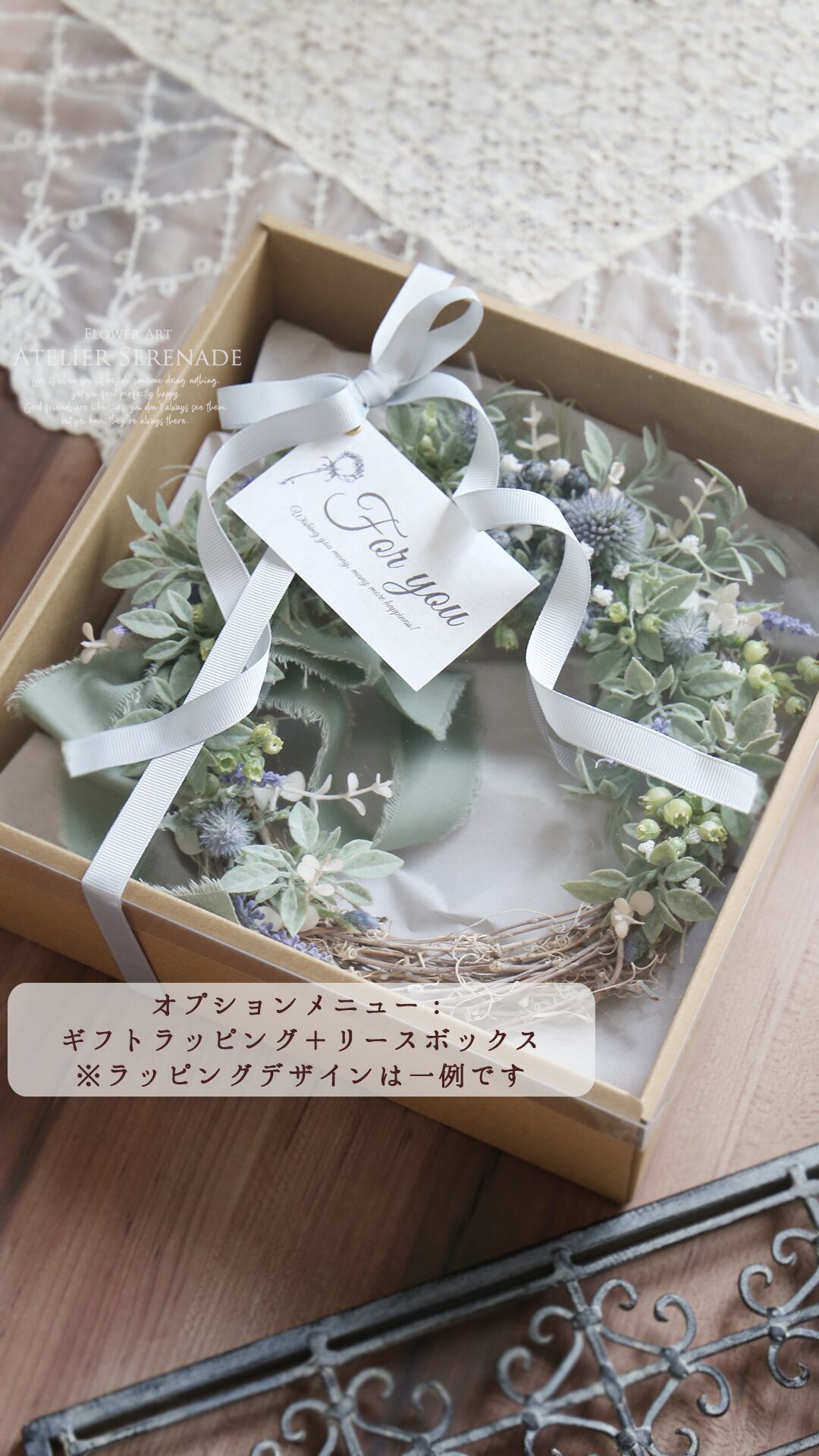 こちらのリースは、オプションメニューにてリースボックスを追加いただけます。ギフトや保管におすすめの、丈夫な化粧箱です。